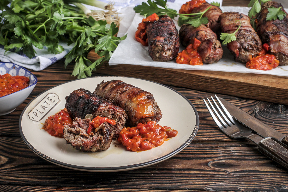 6. Сформируйте из фарша продолговатые котлеты, оберните беконом.