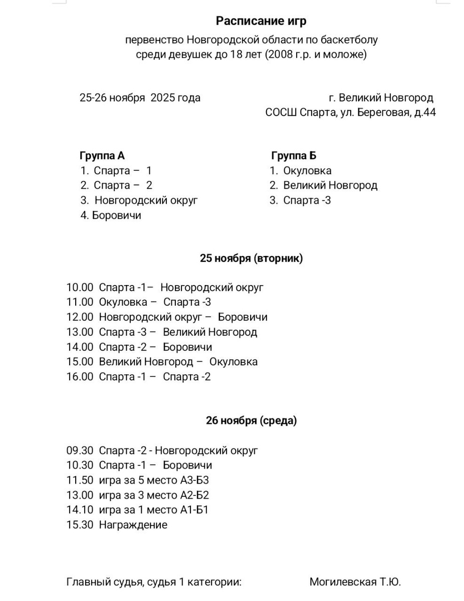 Расписание 📅 матчей первенства Новгородской области по баскетболу 🏀 среди девушек до 18 лет (2008 г. р. моложе)