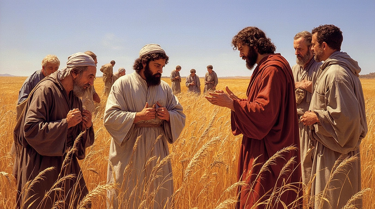 На смену городским спорам в домах и на площадях пришли просторы полей. Однажды в субботу, в день, освящённый законом и обременённый множеством человеческих постановлений, Иисус проходил с учениками по засеянным нивам. Это была картина, полная сельского покоя. Золотистые колосья пшеницы, почти поспевшие, тихо шумели на лёгком ветру, отливая на солнце. Дорога, узкая и пыльная, вилась между участками. Воздух был напоён тёплым запахом земли и зреющих хлебов. Ученики, проголодавшиеся после долгой дороги, и дорогою начали срывать колосья. Их движения были просты и естественны, как и у тысяч их предков, закон Моисея прямо разрешал утолять голод в чужом поле. Но они нарушали не закон Божий, а тяжёлую, мелочную сеть фарисейских преданий, которые превратили субботу из дня отдыха и радости в день страха перед случайным нарушением. И тут, как будто из-под земли, появились они. Фарисеи. Их бдительные глаза ничего не упускали. Увидев, что ученики срывают колосья и растирают их в ладонях, чтобы съе