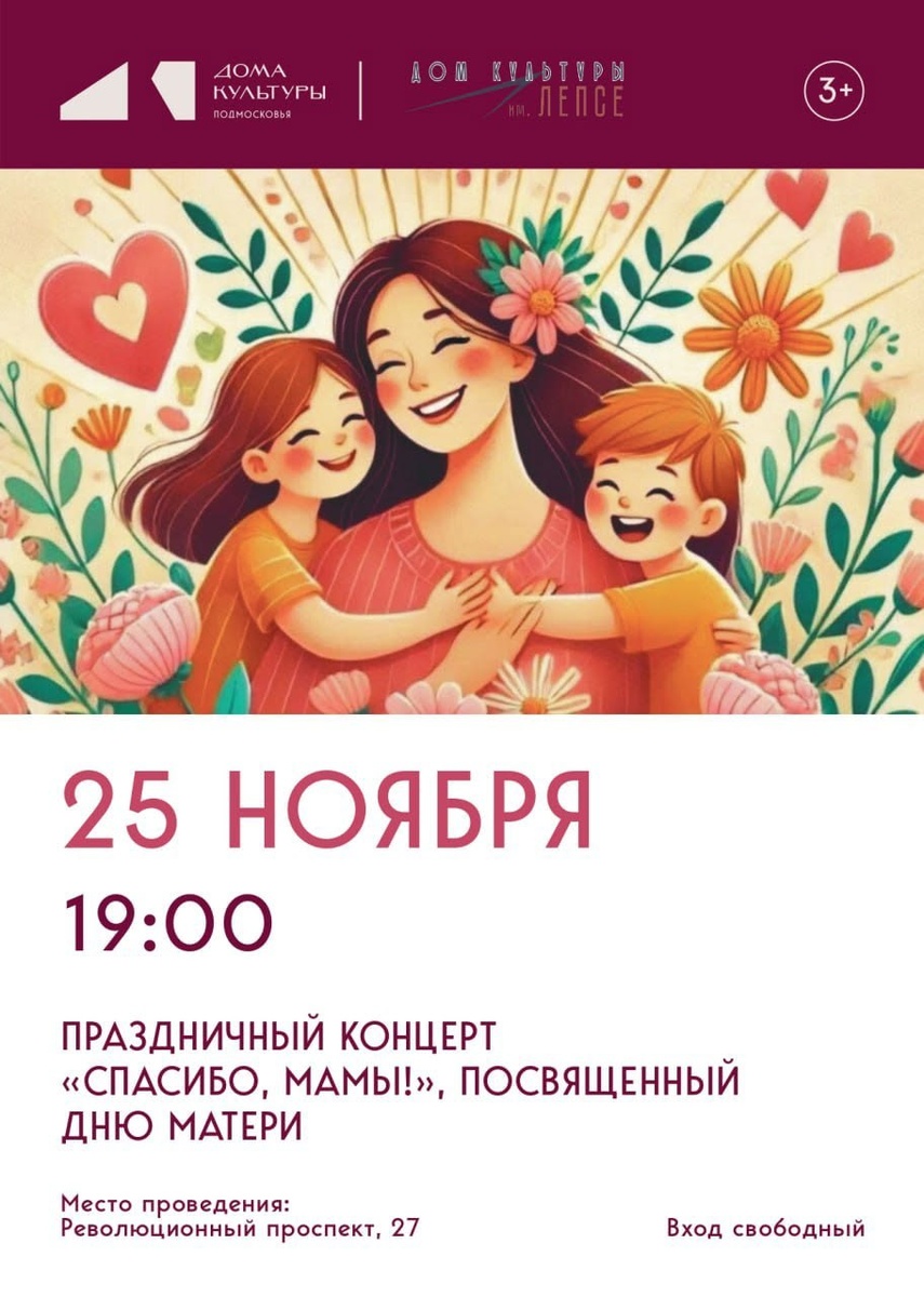 ✨ Концерт, посвященный Дню матери! ❤️ Приглашаем вас на теплый и душевный праздник. 🚫 Возраст: 0+ 📆 25.11.2025 🕒 19:00 🏢 Дом культуры им. Лепсе 📍 г. Подольск, Революционный просп., 27 💰 Вход свободный❗️ ⭐Поддержать канал голосом 🍰Где поесть в Подольске ✅ Мероприятия Подольск https://dzen.ru/id/66ed500f7b5671493eca3fd6 http://vk.com/podolsk_events http://dzen.ru/podolsk_events
