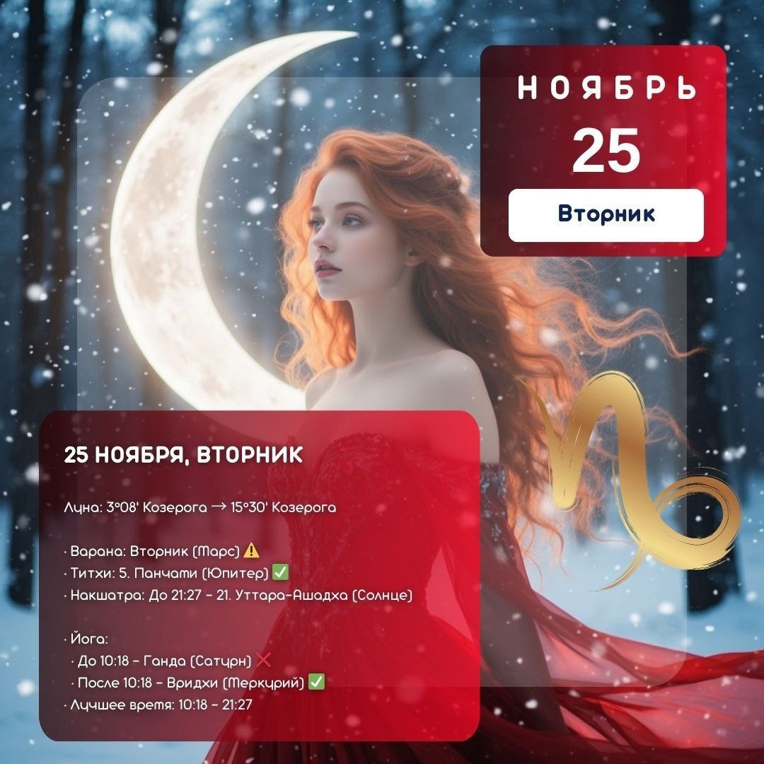 Астродайджест на 25 ноября 2025 Общая энергия дня: Стабильная Победа и Волевой Рост Сегодняшний день - смесь марсианской решимости и козерожьей дисциплины: не для спонтанных подвигов, а для вдумчивых, стратегических шагов, которые закладывают фундамент будущих побед. Истинная сила сегодня - в верности долгу, служении и любви, что резонирует с праздником Вивах Панчами. Ключевые аспекты дня Вторник - день Марса: энергия решимости, защиты и преодоления препятствий. Идеально для спорта, работы с инструментами и волевых решений. Луна в Козероге даёт структурность и сдержанность эмоций - вы принимаете решения взвешенно и ответственно. Накшатра Уттара Ашадха (до 21:27): «накшатра победителей» - благоприятна для стартов, особенно когда за спиной есть поддержка предков и союзников. Пятые лунные сутки: энергия очищения, исцеления и учебы. Благоприятны духовные практики и восстановительные ритуалы. Что сегодня усиливается - практики и советы Планирование и стратегия: составьте дорожную к