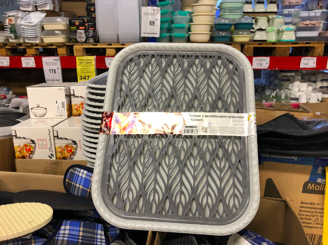 Всем доброго дня! В ближайшем обзоре расскажу о новых поставках, которые появились в магазине «Светофор». Ассортимент на полках заметно расширился, и среди товаров есть как полезные бытовые мелочи, так и крупные покупки для дома. Расскажу обо всём по порядку, но товары я специально перемешал, чтобы обзор получился более разнообразным. Начну с кухонных принадлежностей. В продаже появился вместительный поднос с вкладышем-сушилкой «Колос». Это прочное изделие из полипропилена размером 47×36 см. Производится в России, выполнено в универсальном сером цвете. Стоимость — 147 рублей. Рядом расположены удобные контейнеры для выпечки с плотной крышкой на защёлках. Квадратная форма (30×30×14 см) позволяет легко переносить пироги и торты, для этого предусмотрена ручка. Контейнер изготовлен из пищевого полипропилена, цена — 178 рублей. Для любителей готовить нашлась и другая полезная посуда. В отделе с акциями появилась алюминиевая жаровня диаметром 28 см. Посуда оснащена антипригарным покрытием