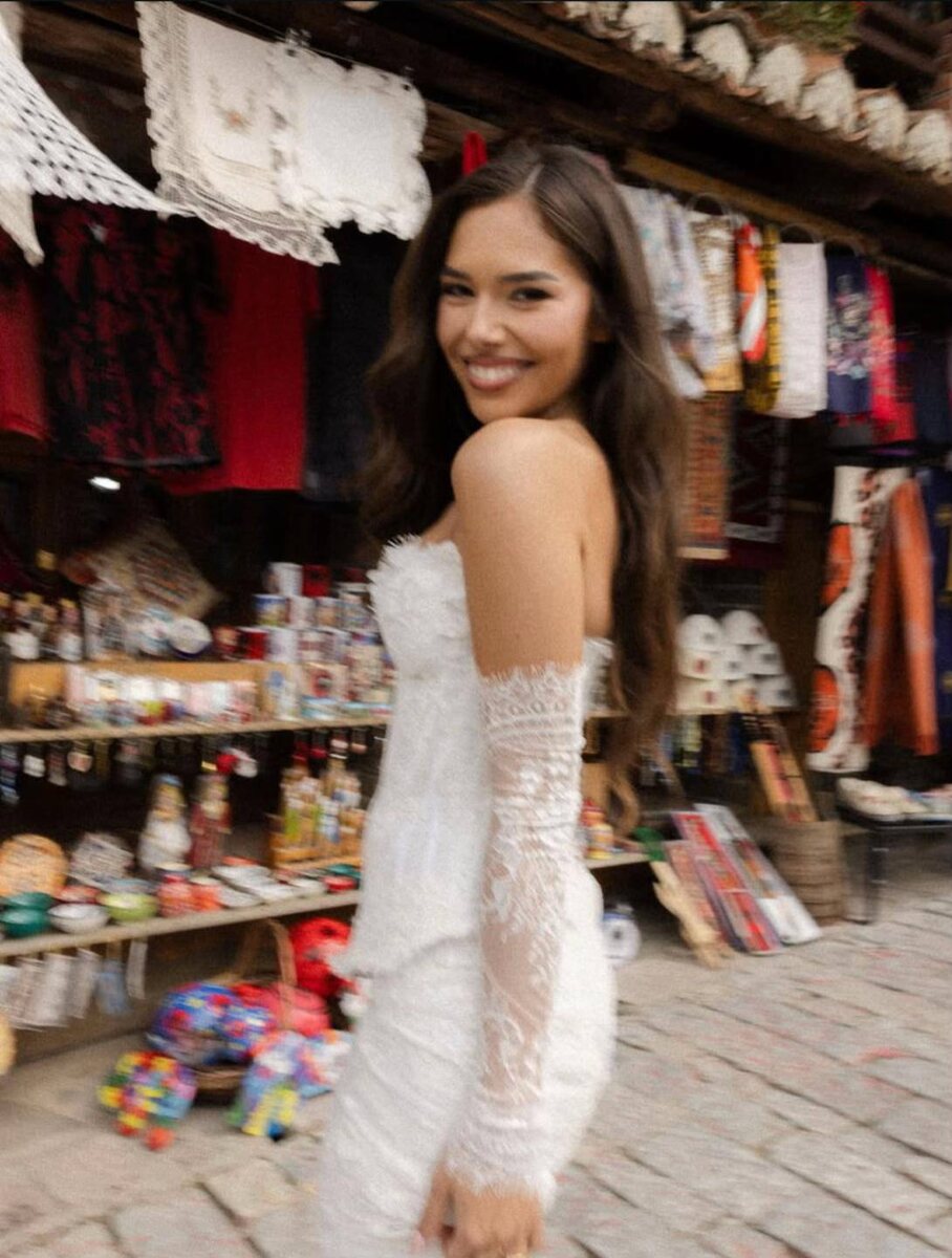 Полюбились мне последнее время вот такие свадебные образы на девушках! Я называю это "кружевной минимализм". Самое основное и акцентное - это конечно же корсет, юбка по фигуре и кружевные перчатки (главное, чтобы перчатки не отличались от материала и фасона платья. Очень часто невесты надевают с платьем из кружева перчатки из атласа, тонкого хлопка, шифона и сетки. Мне очень нравится, когда все в одном сочетании, если кружевное платье, то и кружевные перчатки обязательно! И еще, пальчики на кисти руки - должны быть открыты, по-моему мнению, есть в этом некий шарм!) По прическе и макияжу так же все очень просто и понятно. Локоны на длинные волосы - это красиво, изящно и нежно. Безусловно, с убранным волосом будет тоже смотреться - замечательно, но если рассматривать образ выше, то я рекомендую локоны! Это первое. А, во-вторых, посмотрите на украшения, их вовсе нет. Знаете почему? Потому что брюнетки со смуглым цветом кожи и платьем белого цвета - могут в этом не нуждаться, это н