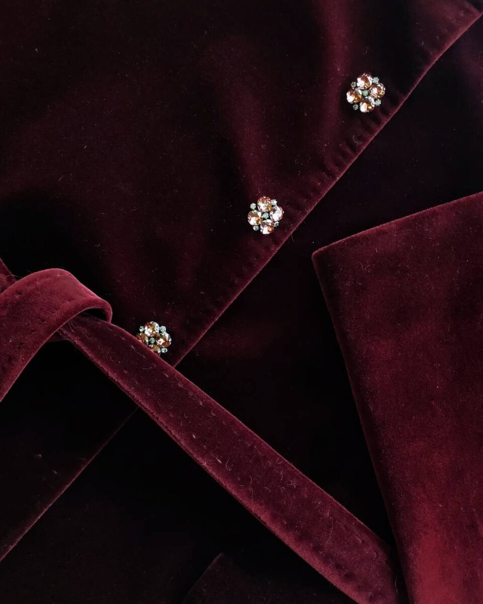Эффектный костюм, созданный мастерами ателье ТИССУРА в Челябинске: ул. Свободы, 76, тел.: +7-351-266-21-87. Костюм для очаровательной Елены выполнен из хлопкового бархата глубокого винного цвета. Ювелирные пуговицы в форме цветка от Secondo Stefano Pavese: — 2 см — 2,5 см
