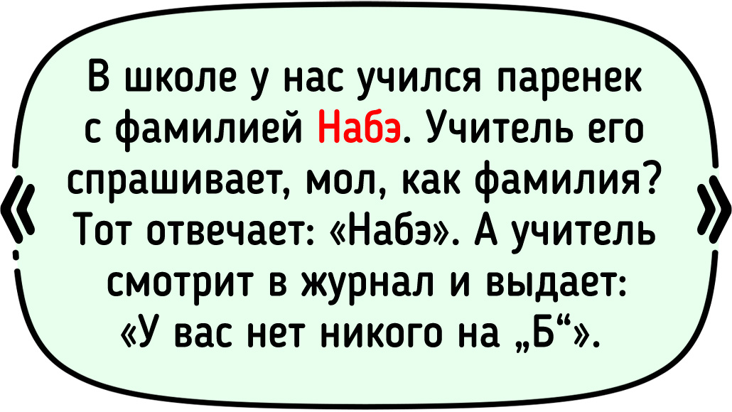 В школе у нас учился паренек с фамилией Набэ. Учитель его спрашивает, мол, как фамилия? Тот отвечает: «Набэ». А учитель смотрит в журнал и выдает: «У вас нет никого на „Б“». © Vbif18 / Pikabu