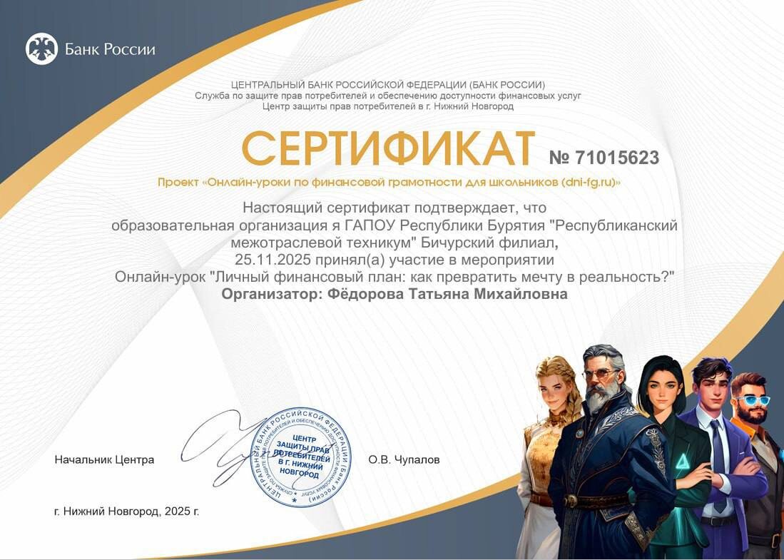 📌 Сегодняшнее событие: ✨ Внимание всем студентам группы Л-25! 💰Только что завершился увлекательный вебинар в Бичурском филиале на тему: «Личный финансовый план: как превратить мечту в реальность?» 🔥 Программа мероприятия была насыщенной и информативной: 1️⃣ Узнали секреты достижения успеха через управление личным капиталом. 2️⃣ Научились грамотно ставить финансовые цели и расставлять приоритеты. 3️⃣ Освоили методы уверенного продвижения к своим финансовым целям. 4️⃣ Получили практические советы по составлению и соблюдению эффективного финансового плана. ✅ Итог встречи: ваши мечты теперь ближе благодаря знаниям и чёткому плану действий! 🗣 Организовала мероприятие Фёдорова Татьяна Михайловна. Присоединяйтесь к следующему семинару и двигайтесь навстречу своему финансовому благополучию вместе с нами! #СПО_БУРЯТИИ #БичурскийФилиал #финансоваяграмотность #личныйфинансовыйплан