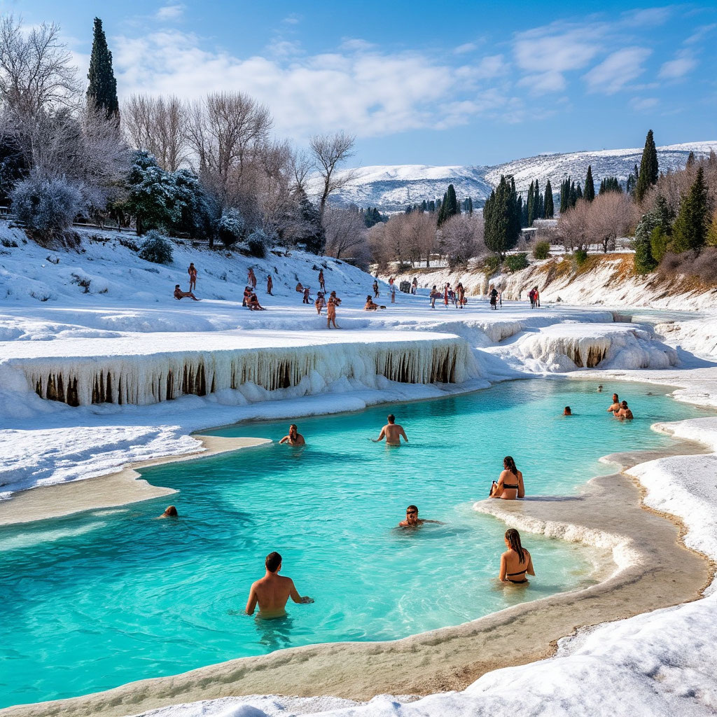 Природа — лучший художник. Но теперь и мы можем творить как она! С помощью нейросетей я превращаю обычные фото в цифровые шедевры. Все инструменты и техники — в моем канале «Мир нейроискусства» https://t.me/mir_neuroiskusstva Зимой в Памуккале особенно волшебно! Представьте: вокруг снег и холод, а вы лежите в теплом бассейне с видом на белоснежные террасы. Расскажу про самые уютные места, где мы с подругами любим греться в декабре. 1. Античный бассейн Клеопатры Говорят, здесь купалась сама царица Клеопатра. Вода +36 градусов, а на дне лежат настоящие мраморные колонны — остатки древнего города. Люблю приезжать сюда утром, когда мало людей. Сторож дядя Ахмет всегда подсказывает лучшие места. 2. Термальный источник в пещере Это место нашла случайно — местный гид Мурат показал дорогу. Маленький грот, где из скалы бьет горячий источник. Зимой особенно красиво: с потолка свисают ледяные сталактиты, а вода парная. Ходить нужно аккуратно — камни скользкие! 3. Деревенские купели в Карахаит