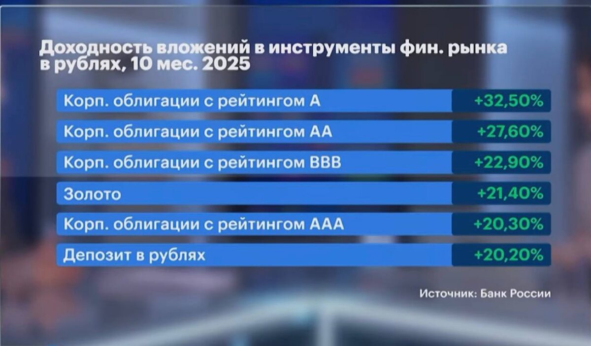 #Стратегия Спасибо Банку России за наглядную статистику по доходности за 10 месяцев этого года. Коллеги подтвердили правильность выбранной стратегии. Обратите внимание за 10 мес 2025 года, корпоративные облигации с рейтингом «А» дали 32,5% годовых Корпоративные облигации с рейтингом «АА» - 27,6 % Даже золото в этом году дало только - 21% Остальные инструменты представлены на рис.1 ❗️Самое главно, что ставка продолжает оставаться высокой и до нового года ещё можно собрать себе хороший облигационный портфель с достойным пассивным доходом в 20% годовых (без учёта роста активов на снижении ключевой ставки) Это при депозитах сейчас в 15% годовых. С 4 декабря у меня стартует Мастер-класс «2я зарплата на облигациях» где у вас будет возможность научиться зарабатывать больше депозита с фондового рынка и собрать качественный портфель к новому году