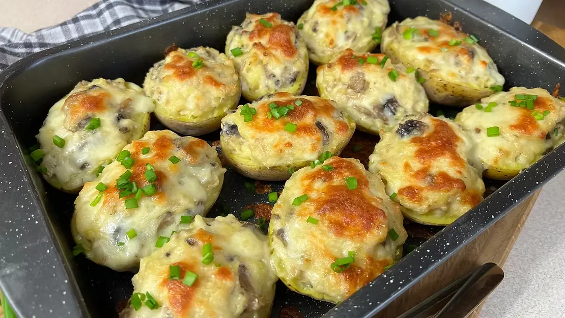 Выложите приготовленную начинку на картофельные половинки Посыпьте оставшимся сыром. Запекать без крышки и фольги около 15 минут при температуре 200 градусов. Приятного аппетита!