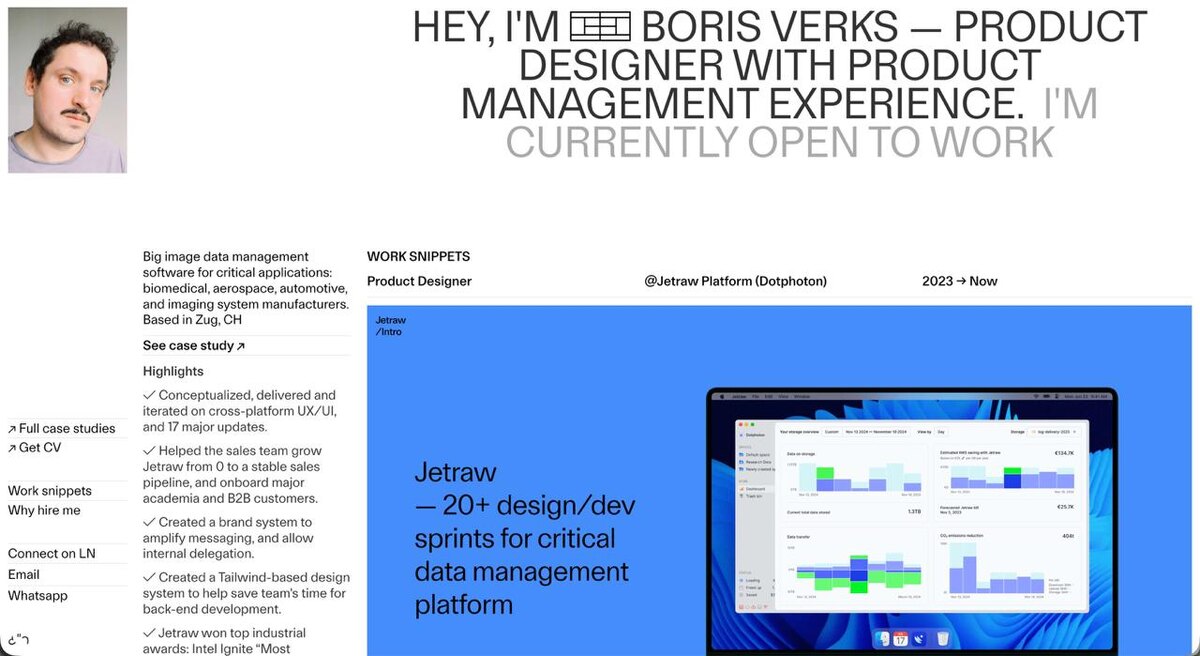 Борис Веркс (Морозов) Что делать, когда все работы — сложные десктопные штуки и фиг их засунешь в мелкие обложки? Растянуть на весь экран! Его портфель — пример как показать В2В сервисы, дизайн-системы. Главный кайф — соотношение картинок и текста. Описания слева достаточно, чтобы понять роль дизайнера и позвать его на собес. Если не хватило, можно глягнуть на презы внутри. Толька зацените как ловко уместилось дискавери на один слайд. Борис умеет себя продавать. Вместо стандартного «я крутой» он пишет «как я смогу быть вам полезен»: Я умею превращать идеи в привлекательные и удобные продукты с помощью UX-дизайна, брендинга, эмпатии и сторителлинга. Со мной вы можете разработать концепцию и вывести новый продукт на рынок или аккуратно улучшить и расширить уже существующий. В конце, когда дизайнер уже понравился — рекомендации, награды и немного личности. Честно, не хочу придираться к портфелю. Можно повонять, что кейсы внутри оформлены в Фигме, так они оформлены в стиле шикарной пр