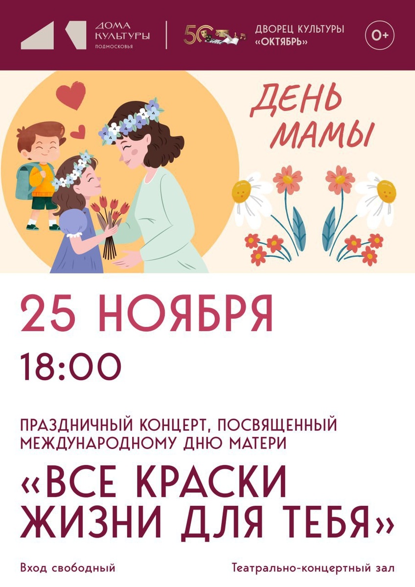 ✨ Концерт ко Дню матери Приглашаем на праздничный концерт "Все краски жизни для тебя", посвященный этому празднику🩷 🚫 Возраст: 0+ 📆 25.11.2025 🕒 18:00 🏢 Дворец культуры «Октябрь» 📍 г. Подольск, ул. Свердлова, д.38 💰 Вход свободный❗️ ⭐Поддержать канал голосом 🍰Где поесть в Подольске ✅ Мероприятия Подольск https://dzen.ru/id/66ed500f7b5671493eca3fd6 http://vk.com/podolsk_events http://dzen.ru/podolsk_events