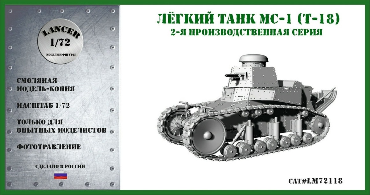 LANCER из Москвы в декабре выпустит модель танка МС-1 в масштабе 1/72. На фотографиях тестовая сборка перед отливкой. Часть деталей, в основном, крупные будут отлиты из полиуретановой смолы, мелочи - выращены на 3D-принтере. Фототравление и декаль в комплекте.