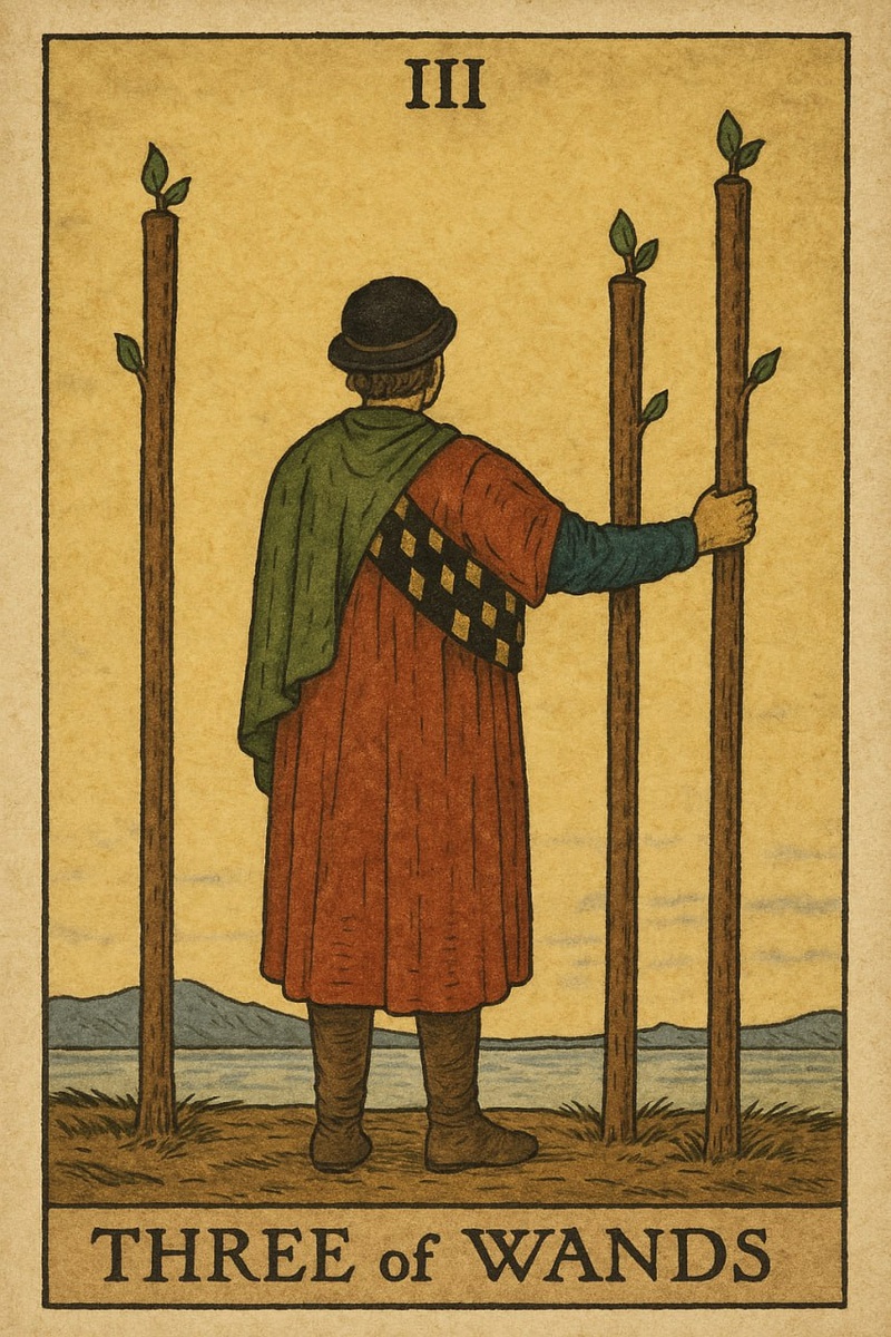 ТРОЙКА ЖЕЗЛОВ Я - взгляд вдаль, в будущее, которое уже зовёт. Я стою на утёсе, и ветер развевает мою одежду. За спиной остался путь, полный труда и сомнений. Передо мной - простор, в котором уже рождаются новые горизонты. Мои корабли уходят в море, и я знаю: они вернутся, если мой замысел ясен и сердце не дрогнет. Я не импульс, как Туз, и не колебание, как Двойка. Я - момент, когда всё уже запущено, но результат ещё скрыт за горизонтом. Я - ожидание с уверенностью. Когда посеянное начало прорастать, но плоды ещё не видны. Я прихожу тогда, когда нужно довериться собственным решениям. Когда всё спланировано и первые шаги сделаны. Моя энергия спокойна, но напряжена, как струна. Я - внутренняя готовность встретить то, что уже идёт к тебе. Мои три жезла - это три точки твоей силы: прошлое, настоящее и будущее. Один стоит позади - это опыт и усилия, которые дали опору. Второй рядом - это текущая решимость, поддерживающая твоё движение. А третий направлен вперёд - это намерение, уже ставш