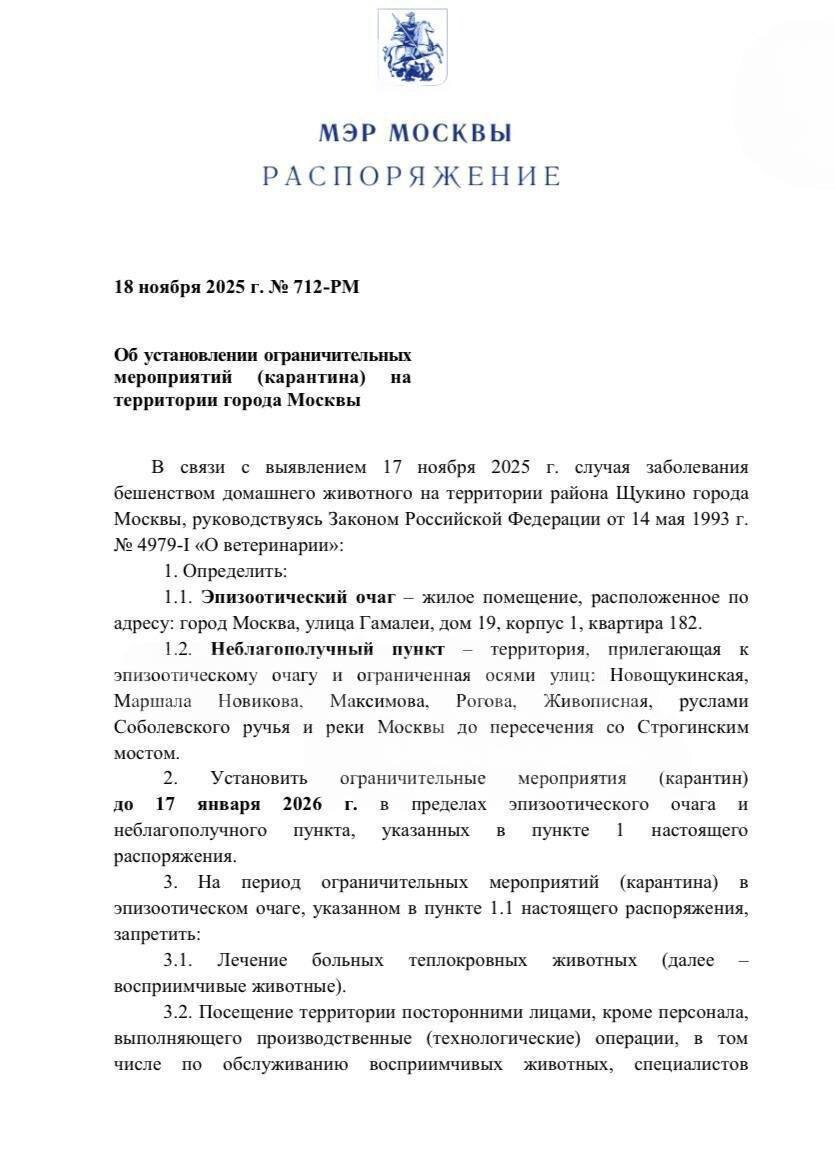 ⚠️ Карантин ввели в Москве из-за вспышки бешенства — заболевание подтвердили у домашнего питомца Меры коснутся района Щукино: карантин вводится до 17 января 2026 года.