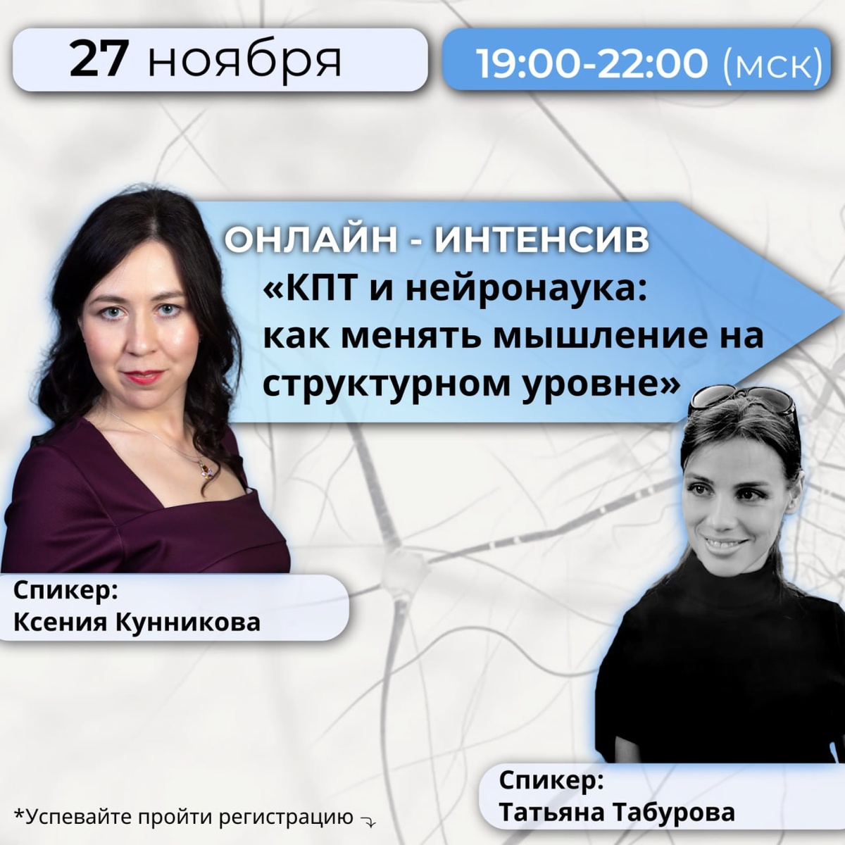 КПТ и нейронаука: как менять мышление на структурном уровне? Как изменить мышление, когда привычные реакции сильнее рациональных решений? Когнитивно-поведенческая терапия (КПТ) объясняет, что мысли формируют эмоции и действия, а нейронаука - «почему» это происходит. На интенсиве вы разберёте: 🟦 как выявлять иррациональные убеждения и трансформировать их; 🟦 как работать с автоматическими мыслями; 🟦 как составлять и анализировать поведенческие эксперименты; 🟦 какие нейробиологические процессы лежат в основе КПТ-подхода. Вы получите: ✔️ структурированные методики для помощи клиентам с тревогой, депрессией и низкой самооценкой; ✔️ понимание, почему КПТ работает на уровне мозга; ✔️ навыки построения эффективных стратегий консультирования. 👥 Эксперты: - Ксения Кунникова - кандидат психологических наук, психофизиолог. - Татьяна Табурова - клинический психолог, преподаватель МУСП. Стоимость участия: 3 500 ₽ 🕓 Дата: 27 ноября, начало в 19:00 - 22:00 (МСК) 🔵 Формат: онлайн ЗАРЕГИСТР