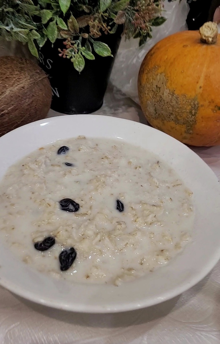 Овсянка, сэр? Нет, кокосовый рай с изюмом! 🥥✨ А вот и он — главный герой утра, который меняет представление о завтраке. Овсяная каша на кокосовом молоке! Это не та пресная обязаловка из детства, а настоящий кремовый десерт, который скрасит даже понедельник. Эта каша надолго заряжает энергией и хорошим настроением. ✔️овсянка или овсяная крупа100гр ✔️вода 250-300гр ✔️кокосовое молоко опционально необязательно ✔️изюм по вкусу ✔️кокосовая паста опционально необязательно ✔️мускатны орех щепотка Овсянку промыть если используете крупу, то желательно предварительно замочить в чистой воде на ночь. утром воду слить, залить свежей отварить до готовности. Хлопья достаточно только промыть без предварительного замачивания Количество воды можно регулировать самостоятельно. Когда крупы или хлопья готовы, я снимаю с огня. Далее промытый изюм добавляем в кашу А также добавляем кокосовое молоко по вкусу и до желаемой консистенции. Также по вкусу добавляем кокосовый урбеч, это необязат