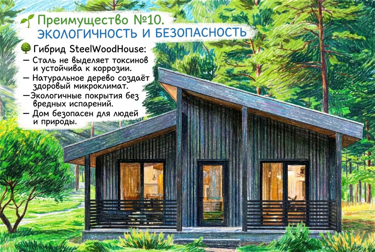 ⚠️ Завершаем цикл публикаций о преимуществах домов с гибридным каркасом из стали и дерева. 🌱 Преимущество №10. ЭКОЛОГИЧНОСТЬ И БЕЗОПАСНОСТЬ 🌳 Гибрид SteelWoodHouse: — Сталь не выделяет токсинов и устойчива к коррозии. — Натуральное дерево создаёт здоровый микроклимат. -Экологичные покрытия без вредных испарений. - Дом безопасен для людей и природы. 🌲 Классический деревянный каркас: -Без правильной обработки подвержен гниению. - Нуждается в химзащите, что снижает экологичность. -Возможны проблемы с вредителями. 🧱 Кирпич: -Производство энергоёмкое. - Возможны минеральные пыли, влияющие на воздух. - Ограничения в выборе эко-отделки. 🧩 Силикатные блоки - Энергоёмкое производство. - Возможны выделения веществ при эксплуатации. -Сложнее добиться стабильных эко-условий. ❕ Вывод: SteelWoodHouse - чистый, безопасный дом, который сохраняет здоровье и уважает природу. #Преимуществадомовсгибриднымкаркасом #экологичныйдом #SteelWoodHouse