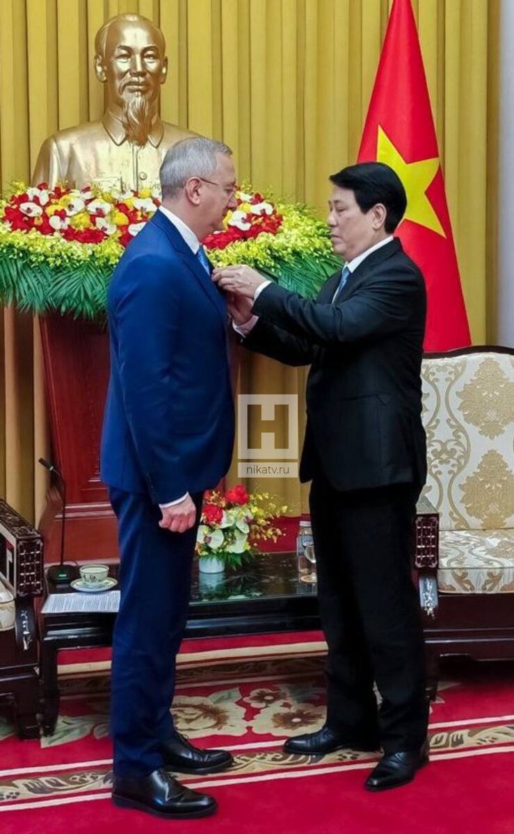 🥇 Шапше вручили государственную награду Вьетнама — Медаль дружбы Губернатор поблагодарил Президента Социалистической Республики Вьетнам Лыонг Кыонга за тёплую встречу и возможность обсудить перспективы сотрудничества между Калужской областью и Вьетнамом. ❤️ Калужане дорожат многолетней дружбой между нашими странами. «Рассказал Президенту Вьетнама о результатах нашей нынешней поездки, договорённостях, которых мы достигли на переговорах с руководством провинции Нгеан. И, конечно, о наших дальнейших планах с корпорацией TH», — отметил Владислав Шапша. Также глава региона представил потенциал и преимущества Калужской области, уделив особое внимание наиболее перспективным направлениям сотрудничества. «Так, большие надежды возлагаем на научно-образовательное партнёрство. Это и студенческий обмен, и совместная работа по борьбе с онкологией с применением радиофармпрепаратов», — добавил губернатор. 👏 Владислав Шапша выразил благодарность за честь быть удостоенным государственной награды