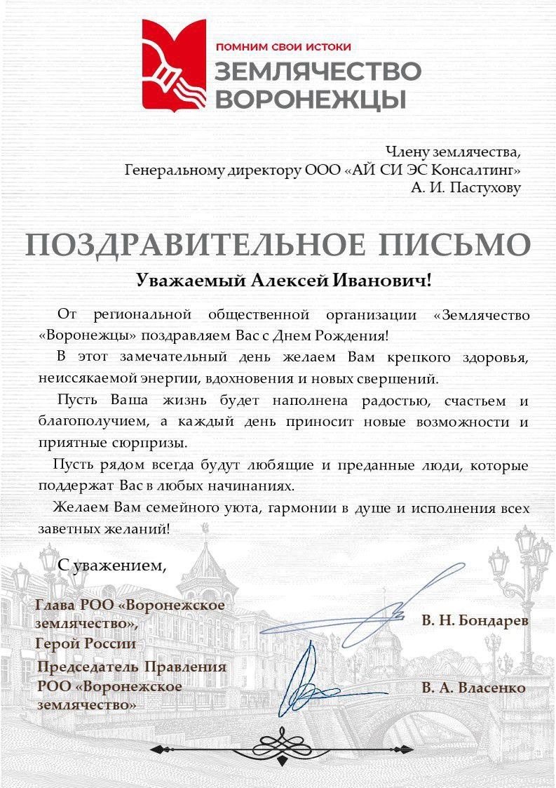 🎉 Представители региональной общественной организации «Землячество Воронежцы» поздравили основателя ICS Consulting Алексея Пастухова с Днём рождения Основатель ICS Consulting получил поздравительно письмо, где выражены искренние поздравления с Днём рождения, пожелания здоровья, благополучия, вдохновения и поддержки близких — всё то, что наполняет жизнь смыслом и помогает идти вперёд. Благодарим! #ICSConsulting #События #АлексейПастухов #Важное