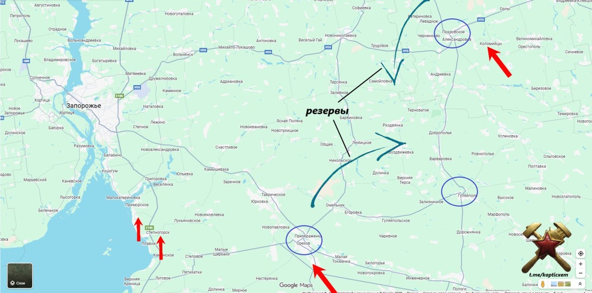 Гуляйполе еще дополнение. Генштаб Украины под Гуляйполе активно перебрасывает войска с других направлений. В ответ российские войска активизировались под Ореховым и Степногорском (Приморское), а так же юго-восточнее Покровское. Если в первых двух случаях идут вязкие связывающие бои, то севернее Покровское проходит транспортная артерия - железная дорога, вот есть подозрение, что цель именно она. схемы и карты