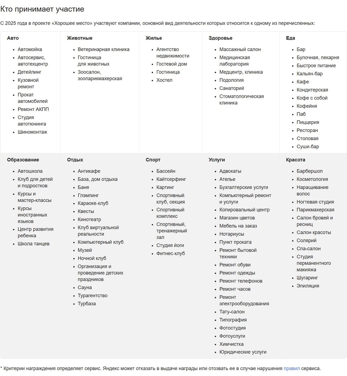 ДЕКАБРЬ… время напрячься, собрать волю в кулак и залететь в последний вагон премии “Хорошее место” от Яндекса 🚂✨ Премия не ждёт, конкуренты не спят, а Яндекс уже потянул ручник — успевает только тот, кто шевелится 😎 🔥 План действий, который спасает рейтинг и шансы на победу: 1️⃣ Проверяем основную категорию Сверяете вашу основную категорию со списком категорий, участвующих в премии. Не совпадает? Меняем. Сразу. Без жалости. Категория — это ваша “дверь” в премию. Не та дверь → не та премия. 2️⃣ Актуальность и синяя галка — must have Нет синей галки = нет участия. Всё. Конец истории. Если не знаете, как её получить — поднимитесь на пост выше в ленте → заберите мой гайд → делаете всё, что там написано. 3️⃣ Рейтинг не ниже 4.5 Не дотягиваете? • Включаем персонал в игру: конкурс “кто соберёт больше отзывов” 🏆 • Мотивируем клиентов всеми легальными (и серыми, но аккуратно 😏) способами • Прокачиваем репутацию, собираем свежие отзывы, закрываем негатив 4️⃣ Январь–февраль: бережём кар