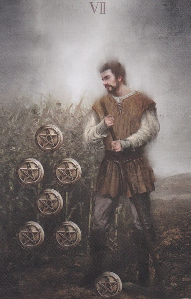 Человек на 7 Земли(пентаклей) фигура остановки в поле труда и ожидания. Он стоит у грядки, на которой уже растут плоды, но они еще не зрелы; он подсчитывает вложенное, прикидывает сроки, досматривает за ростом. В этой позиции время ощущается иначе, не как быстрый бег Кроноса и не как внезапный всплеск Кайроса, а как медленный, наблюдательный Циклос, в котором садовник и свидетель, и соучастник. Но сразу же начинаешь замечать, что образ этот многослоен, в нём есть надежда, усталость, сомнение и аккуратная гордость. Это не просто подсчёт урожая, а разговор с собственной сделанной ставкой. О чём думает этот человек? Во-первых — о ценности вложенного. Взгляд его словно проходит по кирпичной кладке поступков: «Сколько вложено труда? Сколько времени ушло? Оправданы ли усилия? Стоит ли ждать дальше?» Здесь проявляется практическая мудрость, не лозунг «больше — значит лучше», а то тонкое мастерство, которое умеет различать плодородную работу от бессмысленного труда, размышление о рентабельно