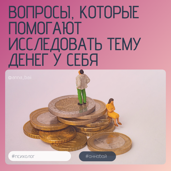 Вопросы, которые помогут исследовать тему денег. Успокойтесь и сосредоточьтесь на своих глубинных мыслях. 1. Что значат для вас деньги? Доставляет ли вам удовольствие думать о них (имеется в виду мысли о деньгах, которые у вас есть, и деньгах, которые вам хотелось бы иметь)? 2.Считаете ли вы, что заслуживаете тех денег, которые имеете? 3. Денег вам хватает или нет? Какие чувства это у вас вызывает? 4.Что вы чувствуете, когда видите действительно богатого человека? 5. Если человек, который вырос в одинаковых с вами условиях, в конечном итоге имеет больше денег, чем вы, что вы при этом ощущаете? Что это говорит о вас? 6. Как вы оцениваете сами себя, анализируя свое финансовое положение? 7. Можете ли вы расценить свое финансовое положение как хорошую поддержку в жизни? 8. Можете ли вы одной фразой определить, какой вы финансист? 9. Как бы вы образно, меиафорично представили деньги?