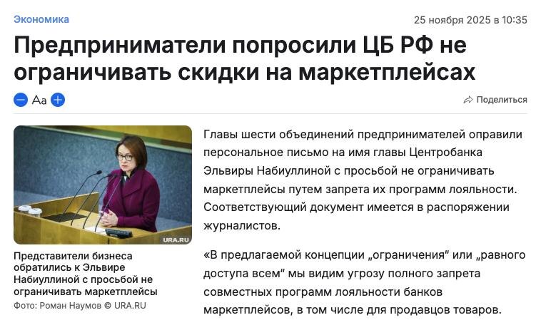 Предприниматели внезапно «встали грудью» за скидки на маркетплейсах Братцы, вот это поворот. Сегодня шесть объединений предпринимателей написали письмо Набиуллиной с просьбой не ограничивать скидки на маркетплейсах, которые банки так активно пытаются прижать. И вроде всё красиво звучит: «Не дайте банкам задушить программы лояльности!», «Это навредит продавцам!», «Цифровые платформы развивают МСП!» Но давайте честно. Это, видимо, те же самые объединения предпринимателей, которые обычно: ✔ просят продлить акции, ✔ просят повысить комиссии на благо селлеров, ✔ хотят регулировать всех вокруг кроме себя, ✔ и стабильно выступают в защиту маркетплейсов, даже когда те творят полную дичь. И среди подписантов — привет, АУРЭК, тот самый «карманный» союз, который всегда «внезапно» поддерживает нужную сторону. По сути письмо про одно: «Не трогайте скидки, они нужны платформам для роста и удержания аудитории». О том, что у этих самых платформ комиссии выросли, логистика дорожает, а скидки фин