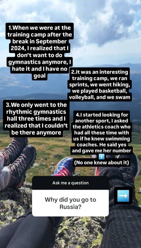 «Я поняла, что больше не хочу заниматься гимнастикой, я её ненавижу» Эльвира Краснобаева о переезде в Россию и трудностях в карьере Почему вы поехали в Россию? Когда мы были на сборах после перерыва в сентябре 2024 года, я поняла, что больше не хочу заниматься гимнастикой, я её ненавижу, и у меня нет цели. Сборы были интересными: мы бегали спринты, ходили в походы, играли в баскетбол, волейбол и плавали. Мы сходили в зал художественной гимнастики всего три раза, и я поняла, что больше не могу. Я начала искать другой вид спорта. Я спросила тренера по лёгкой атлетике, который всё это время был с нами, знает ли он тренеров по плаванию. Он ответил утвердительно и дал мне её номер. (Никто об этом не знал). Но я не позвонила, а решила написать. Она ответила мне, но потом я узнала о возможности переехать в Россию и выступать за Армению, и я решила, что, возможно, это разнообразие поможет мне снова полюбить этот вид спорта. Но нет, там не сложилось, потому что после 2-месячного перерыва ни од