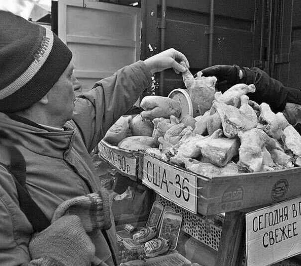 СССР, 1990-е. «Ножки Буша». Для многих семей это было почти единственное мясо — дешёвое, странное, но спасительное. Очереди за ними собирали целые подъезды, соседи узнавали друг друга лучше, чем родственников. Эти окорочка стали символом нового времени, когда привычное стало редкостью.