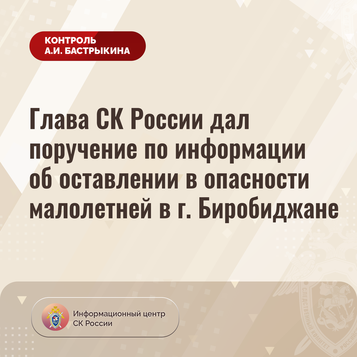 Глава СК России дал поручение по информации об оставлении в опасности малолетней в г. Биробиджане В телеграм-канале сообщается о нарушении прав трехлетней девочки в городе Биробиджане. В ноябре текущего года ребенок, ранее оставленный матерью по месту жительства под присмотром знакомой, был обнаружен в ночное время на улице без верхней одежды и обуви. Пострадавшая с переохлаждением госпитализирована. В СУ СК России по Хабаровскому краю и Еврейской автономной области перед прокурором инициирован вопрос о передаче материалов уголовного дела, расследуемого по данному факту в органах внутренних дел, в свое производство. Председатель Следственного комитета Российской Федерации Александр Иванович Бастрыкин поручил руководителю СУ СК России по Хабаровскому краю и Еврейской автономной области Станиславу Юрьевичу Белянскому принять предусмотренные законом меры к передаче и получению уголовного дела для дальнейшего расследования в производство подчиненных следователей и представить доклад о пре