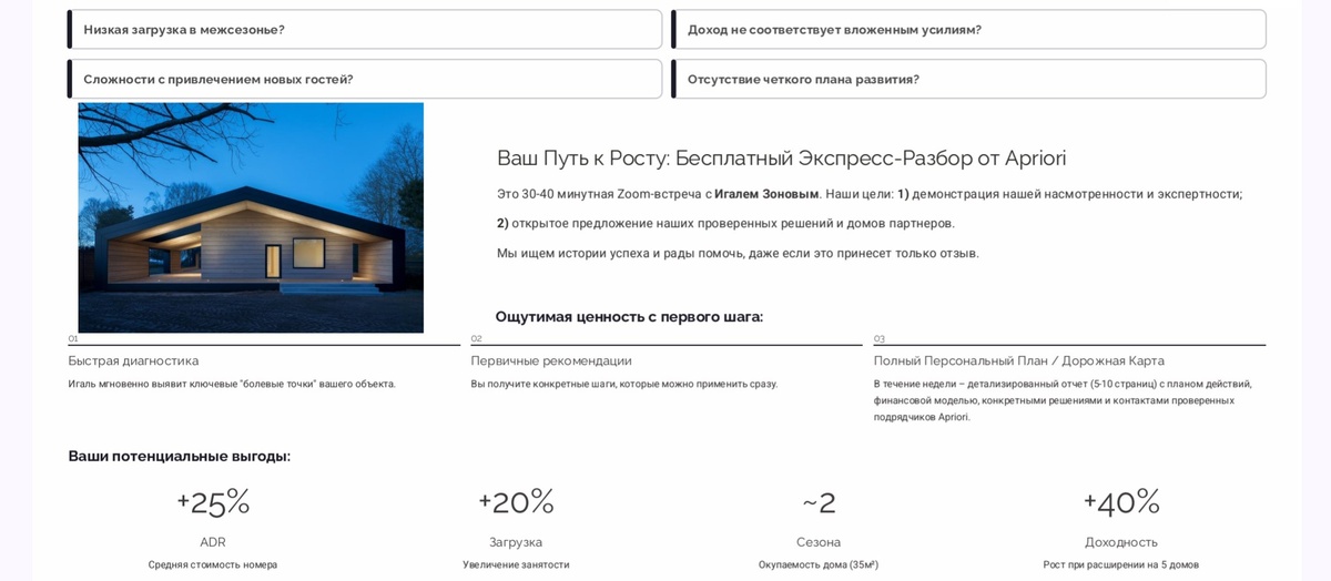 Хотите повысить загрузку и рентабельность вашего отеля? Намеренно задаём несколько провокационный вопрос для привлечения внимания😁 Как проходит бесплатный аудит от Игаля Зонова: - Пишите или звоните +79037981414. К номеру привязан телеграм @apriorib2b. - На созвоне выясняем ситуацию. - Игаль проводит анализ и составляет рекомендации в течение оговоренного срока. - Вы получаете документ с экспресс-разбором ситуации и общим планом развития. С этим планом вы можете работать самостоятельно и повышать эффективность бизнеса. Помните - “Априори” больше, чем просто строительство!