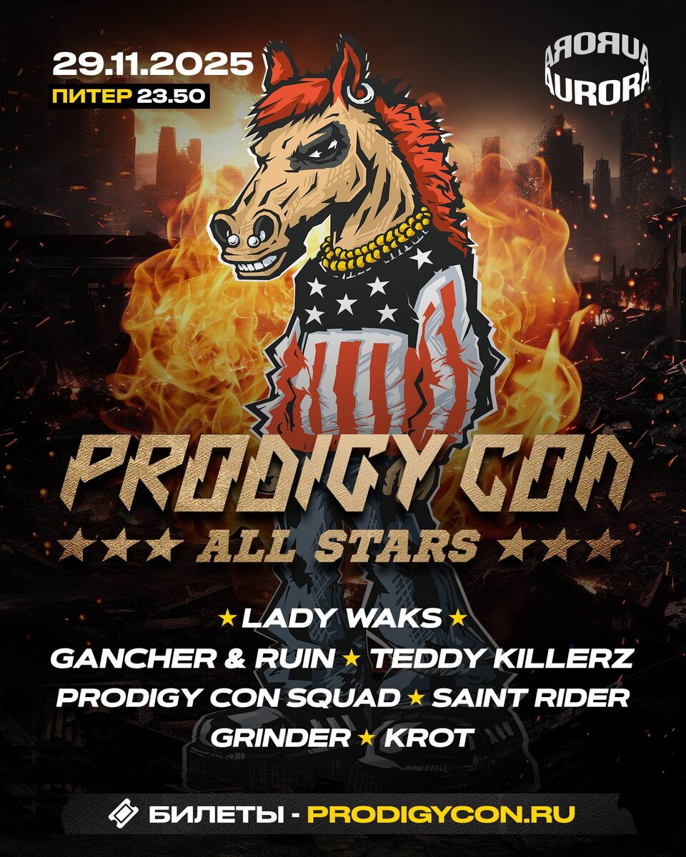 PRODIGY CON ALL STARS @ AURORA (СПБ) 29 ноября В минувшие выходные Конь прошелся по столичному Base. А уже в эту субботу будет брать штурмом питерскую Аврору! Это Prodigy Con, детка 🔥 Хедлайнеры: королева невских вибраций Lady Waks, буржуазия отечественного драм-н-бейса Gancher & Ruin и Teddy Killerz, святой бейс-наездник Saint Rider, питерские нейропанки Krot и Grinder, трио столичных отморозков Prodigy Con Squad (Gordy, Virus19xx, Burger)! Подробности в канале @prodigycon 🎫 Билеты Промокод на 10%: DVIZH 📆 29 ноября, 23:50 - 06.00 📍 Aurora, Санкт-Петербург, Пироговская наб., 5/2