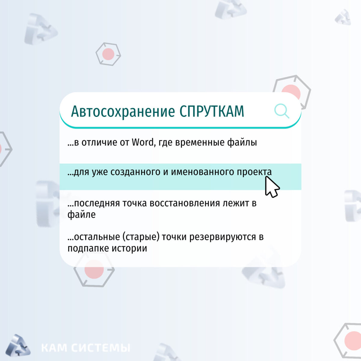 Перед началом работы в СПРУТКАМ обязательно сохраните проект и дайте ему имя. Это занимает пару секунд — зато экономит часы работы и нервы ▫️В СПРУТКАМ автосохранение работает только для уже созданного и именованного проекта ▫️В отличие от Word, где временные файлы иногда спасают при внезапном выключении, здесь несохранённый проект может быть утерян ▫️При каждом сохранении система создаёт точку восстановления — полное состояние проекта в конкретный момент времени ▫️Последняя точка восстановления лежит в файле проекта: *.stcp. ▫️Остальные (старые) точки резервируются в подпапке истории: "<папкапроекта>/__history/<имяпроекта>.stcp.~back" ▫️<папкапроекта> — папка исходного проекта ▫️<имяпроекта> — имя файла проекта ▫️Для экономии места новые точки сохраняют только изменённые данные по сравнению с предыдущими версиями 1️⃣Перед началом работы: Сохранить как ▶️ дайте осмысленное имя и выберите папку проекта 2️⃣Делайте периодические сохранения вручную, особенно перед крупными изменениями 3