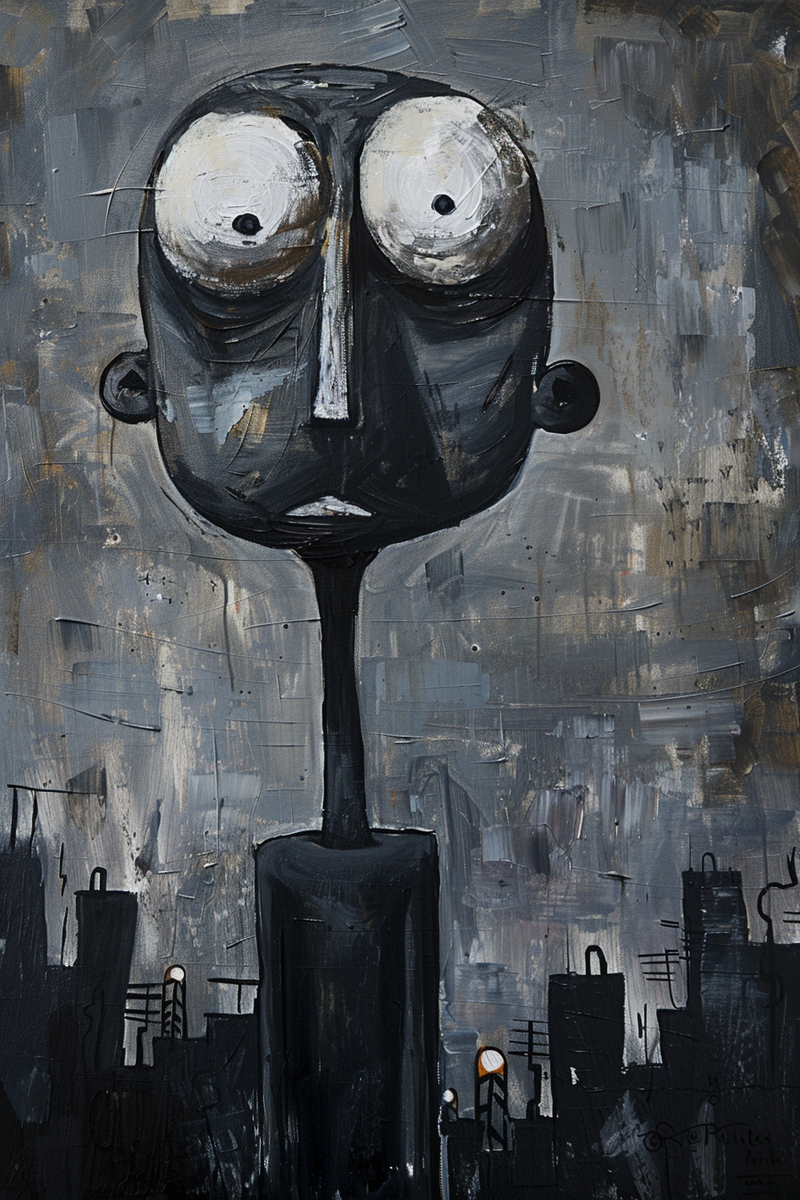 Промпт: A stylized humorous caricature painting of a lanky, thin boy-like figure in a close-up portrait with exaggerated oversized white eyes and an elongated head and neck; satirical, expressive linework with bold, slightly sketchy black outlines and visible textured oil/acrylic brushstrokes and canvas grain. Dark, moody gray city background with subtle skyline silhouettes and high-contrast cinematic lighting; shallow depth of field focusing on the face; limited muted palette of grays and blacks with one vivid warm orange accent from a nearby street lamp; slightly raw, unpolished aesthetic, whimsical and immersive. A highly detailed oil painting. --ar 2:3 Понравились картины? Ставьте лайк, оставляйте комментарии и делитесь своими идеями для будущих шедевров!