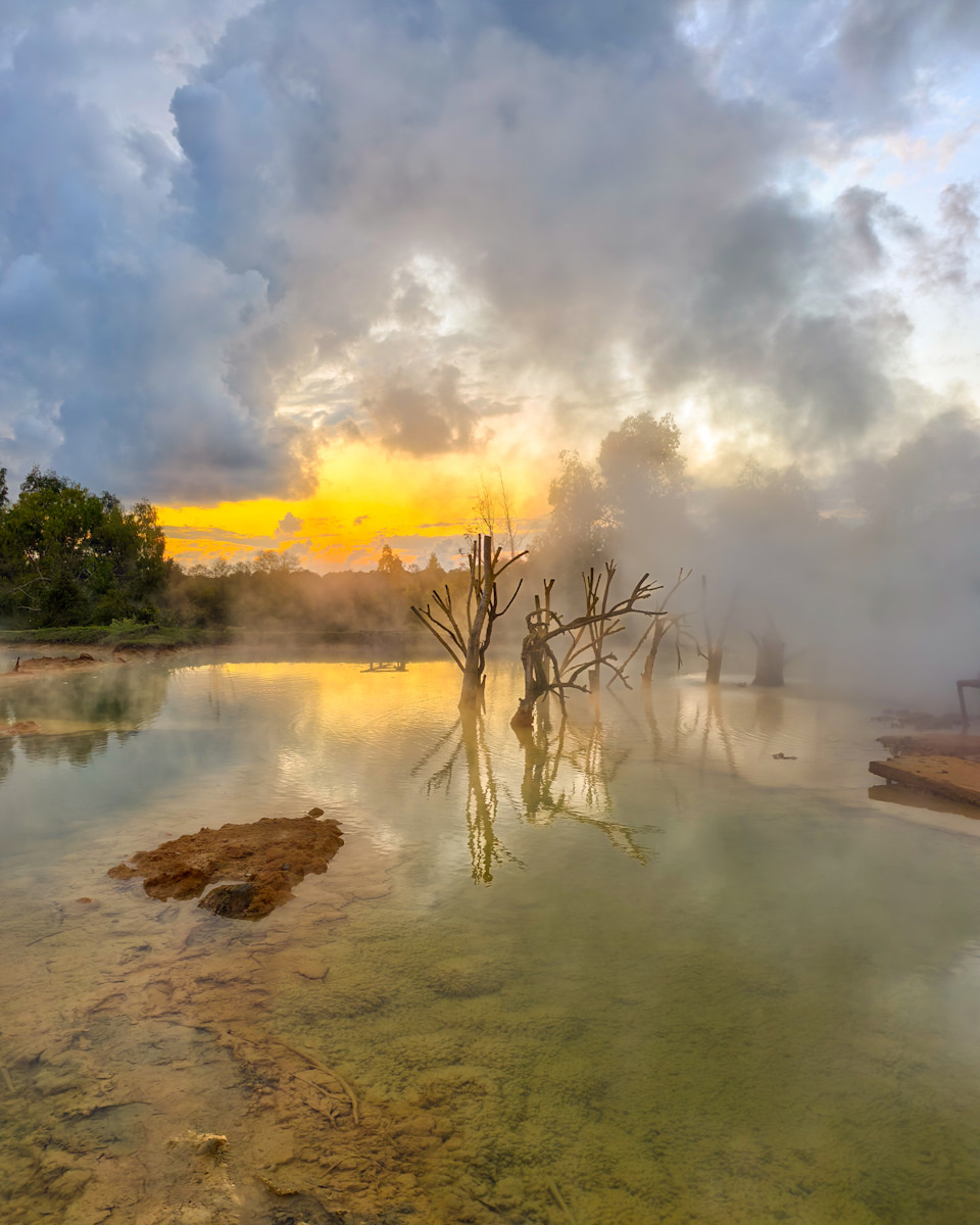 Самый прикол, что из кипятка вода идёт в следующие бассейны, ниже и ниже, получается, в последнем Вы купаетесь в чужой грязи. Поэтому мы его вообще не посещали, ходили везде в шлёпках. Есть "массаж" — это горячая вода падает Вам на спину. Есть земля где кучу грязи и люди ей мажутся.