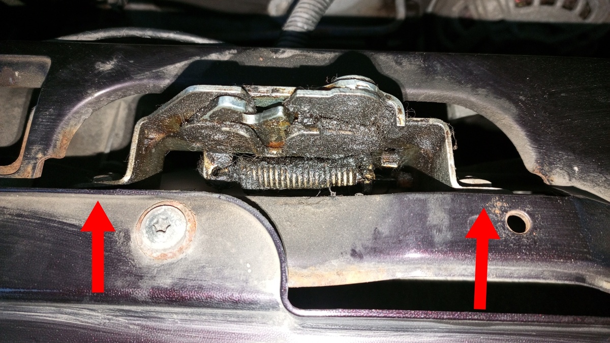 Замок капота крепят два болта. Надо их открутить. Немного придётся доработать решётку радиатора, но внешне не заметно. Понадобится: фонарик, паяльник (напильник или пилка), головка на 8 под квадрат 1/4, удлинитель 150 мм под квадрат 1/4, вороток. Вырезаю паяльником или пилкой небольшой кусок решётки , в месте на фото так, чтоб в отверстие прошла головка на 8. получилось так В сделанное отверстие открывается доступ к левому болту замка. Головкой на 8 с удлинителем откручиваю болт. Здесь головка проходит идеально через соту решётки, просто откручиваю болт. Замок откручен. Открываю капот вместе с замком. Остаток троса выйдет из рубашки. На всю работу ушло менее 10 мин.