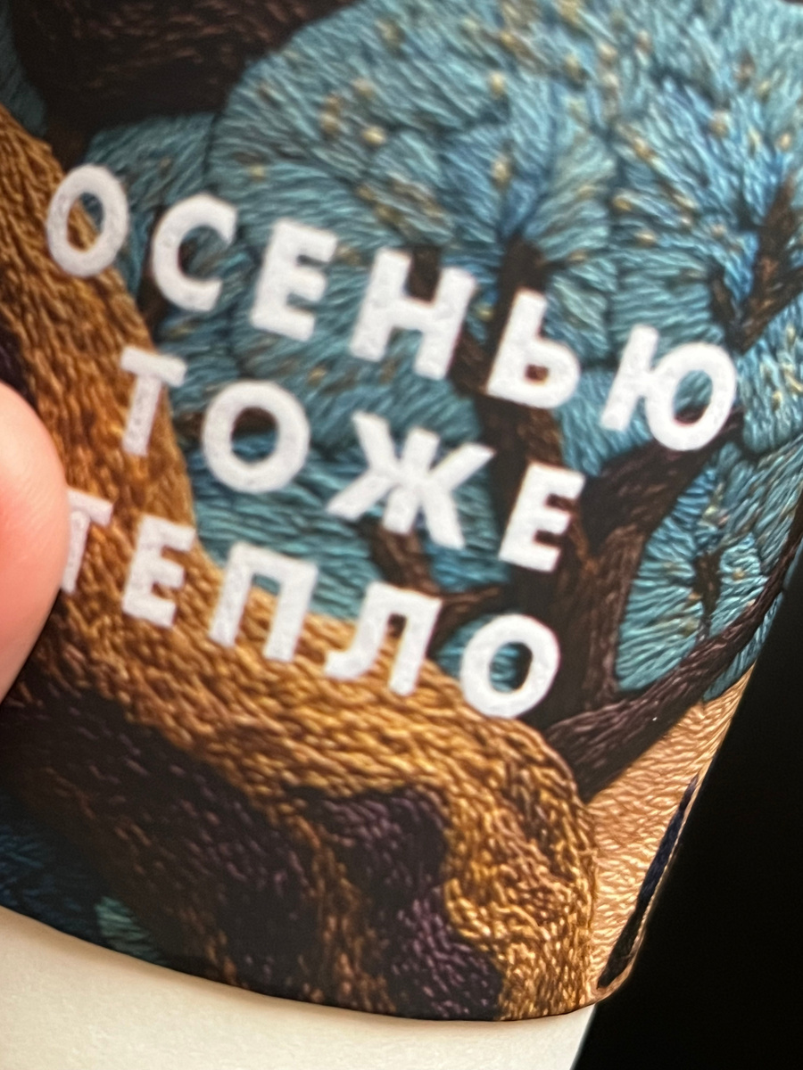 Вслед за видео про этот "чудо - стаканчик" из под выпитого кофе, который очень понравился мне своим дизайном, я захотела показать поближе все его стороны . Дизайнерская картинка на стаканчике выглядит "живой" и действительно привлекает теплом сюжета меня как вышивальщицу - самоучку. Я люблю такие мелочи в жизни, которые радуют и поднимают настроение. Начинается картинка с "вышитых" деревьев, похожих на серебристые ивы, которые при свете дня переливаются серо-голубым оттенком и расположены вдоль песчаного берега у горного водоема. В горной местности живут люди , которые любят гулять в этих окрестностях. Видно, что это происходит осенью и все одеты по-теплому. Здесь прогуливаются и взрослые парочки, и одинокая молодежь и внизу дети - подростки. Их лиц не видно, но понятно, что их взгляды устремлены на красоту осенней природы. Краски осени легли еще на одно дерево и оно красиво вписалось в дизайн сюжета. Все полотно заполнено аккуратными стежками и возможно, что картинка как коп