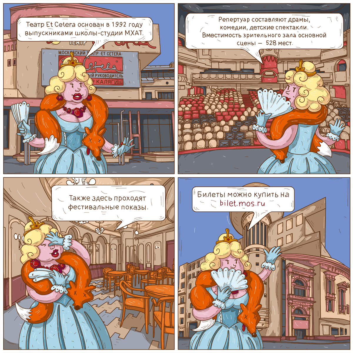 Сайт театра: https://et-cetera.ru/ Название «Et Cetera» («И так далее») не просто красивые слова. Оно символизирует, что театр открыт для всего нового, разного, непознанного. Всё, что будет происходить на сцене, лишь начало, за которым последует «и так далее». Бесконечное развитие и поиск.