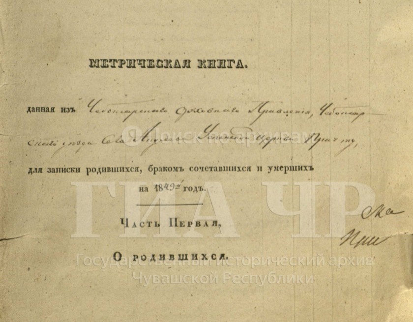Метрические книги о рождении, браке и смерти за 1849 год. 1 января 1849 - 31 декабря 1849. ГИА Чувашской Республики, фонд № 225, опись № 3, дело № 118, стр. 1455 скан. Метрическая книга, данная из Чебоксарского духовного правления Чебоксарского уезда села Акулева Успенской церкви причту, для записки родившихся, браком сочетавшихся и умерших на 1849 год. Часть первая. О родившихся. Стр. 1512 скан. Декабрь. № 121. 4 числа родился. 10 числа крещен. Николай. Села Сундыря казённый крестьянин Зиновий Егоров и законная жена его Евдокия Феодорова, оба православного исповедания. Восприемники: Того ж села казённый крестьянин Феодор Иванов Коротков и того ж села умершего казённого крестьянина Егора Алексеева Мочалова жена Мария Степанова. Священник Стефан Андреев Цивильский. https://yandex.ru/archive/catalog/20d1cd7c-8d16-4eba-a6f0-4ac905880090/1512