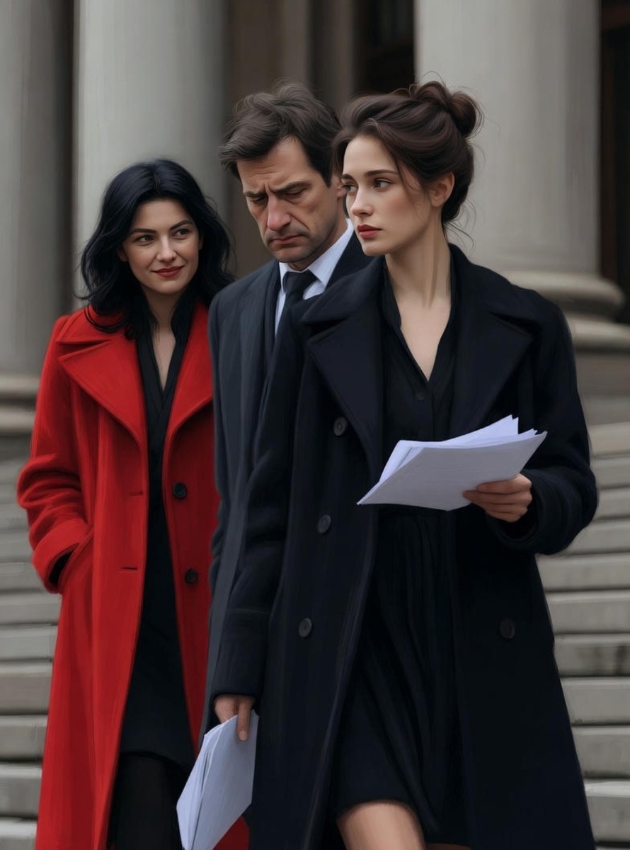 На нижней ступени стояла Лера — высокая, в обтягивающем бежевом пальто, с идеально уложенными светлыми волосами и губами цвета спелой вишни. Рядом с ней, чуть позади, муж Кати, Дима, смотрел в сторону, будто вдруг заинтересовался архитектурой советского модернизма на фасаде суда.