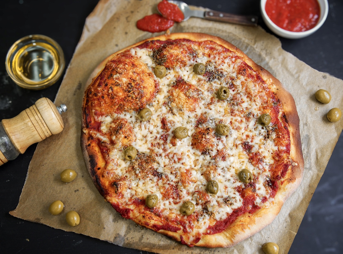 8. Смажьте поверхность чесночным маслом, посыпьте тертым сыром и выложите оливки (при желании разрезанные пополам).