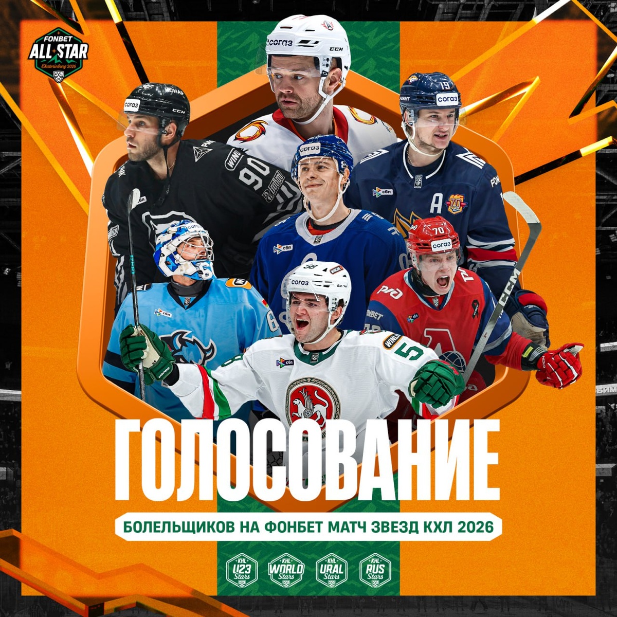 Выберите своих звезд на #KHLAllStar! Голосуйте, кто должен быть включен в состав четырех новых команд на Фонбет Матч Звезд КХЛ 2026 в Екатеринбурге: - Ural Stars - RUS Stars - U23 Stars - World Stars ⭐️ ГОЛОСОВАТЬ ⭐️