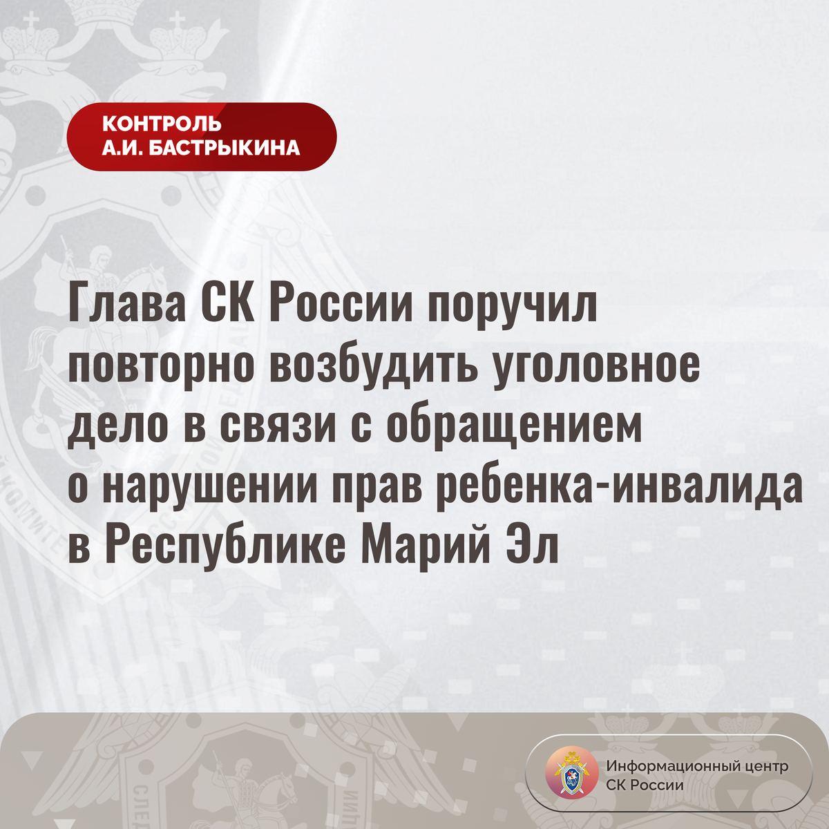 Глава СК России поручил повторно возбудить уголовное дело в связи с обращением о нарушении прав ребенка-инвалида в Республике Марий Эл