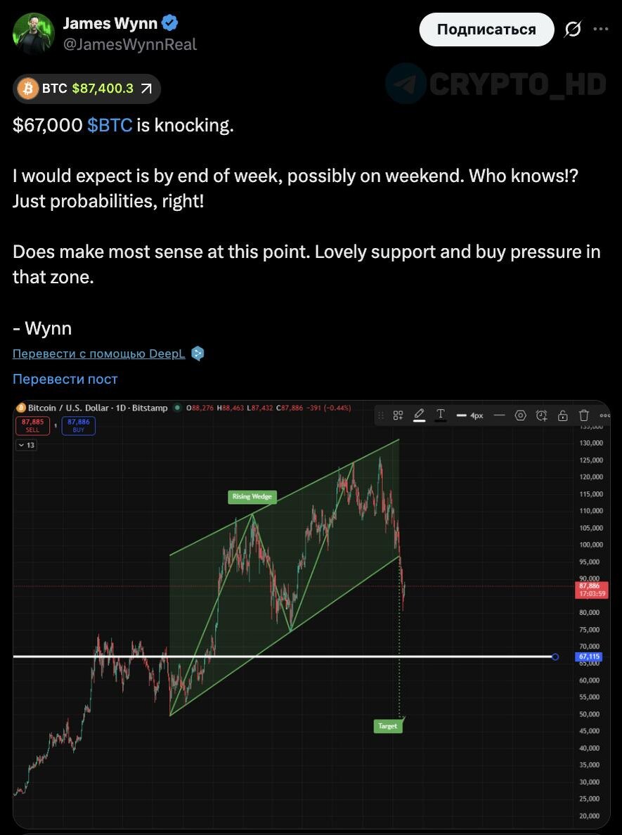 😡 Джеймс Уинн уверен, что BTC снизится до $67,000 к концу недели