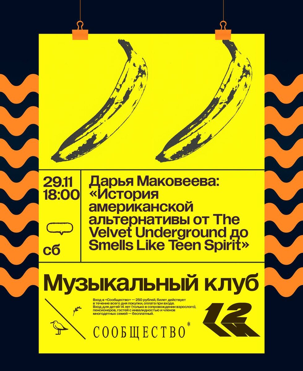 На этой неделе премьера в лекционном зале «Сообщества»: 🗓️ 29 ноября в 18:00 2️⃣ Лекция: «История американской альтернативы от The Velvet Underground до «Smells Like Teen Spirit» — Дарья Маковеева (историк, лектор по истории поп-музыки и автор курса «История винила»). • Из подполья к первым строчкам хит-парадов. The Velvet Underground, группа, в названии которой буквально — подполье, не смогла полюбиться массовому слушателю, зато каждый, кто купил их пластинки, задумался о создании самостоятельной музыки. Таковы легенды, и они кажутся вполне оправданными. Со временем в Нью-Йорке и других американских городах начинает развиваться волна альтернативной музыки, и многие из таких музыкантов будут называть The Velvet Underground своими вдохновителями. Эта музыка, грязная и неотесанная, пройдет большой путь и в 90-х годах наконец полюбится большой аудитории. • Эта лекция будет посвящена тому пути, которую прошла американская альтернатива с конца 60-х годов и до фурора, вызванного Nirvana