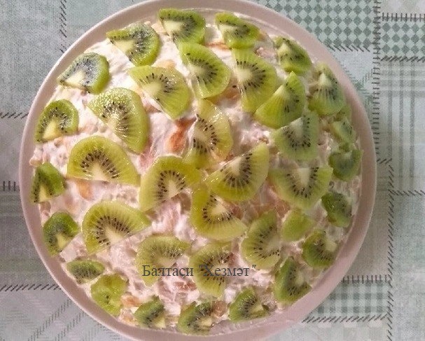 Гөлзидә Газизуллинадан кивилы торт рецепты Кирәк булачак: 500 грамм сметан, 300 грамм балык печеньесы, чама белән песок, 2-3 банан һәм киви. Печеньены сметан һәм песок салып болгатабыз, шуңа банан турап салабыз, яхшылап болгатабыз. Әзер массаны зур тәлинкәгә үзегезгә ошаган формада урнаштырасыз. Өстен туралган киви белән бизисез. Тәмле булсын!
