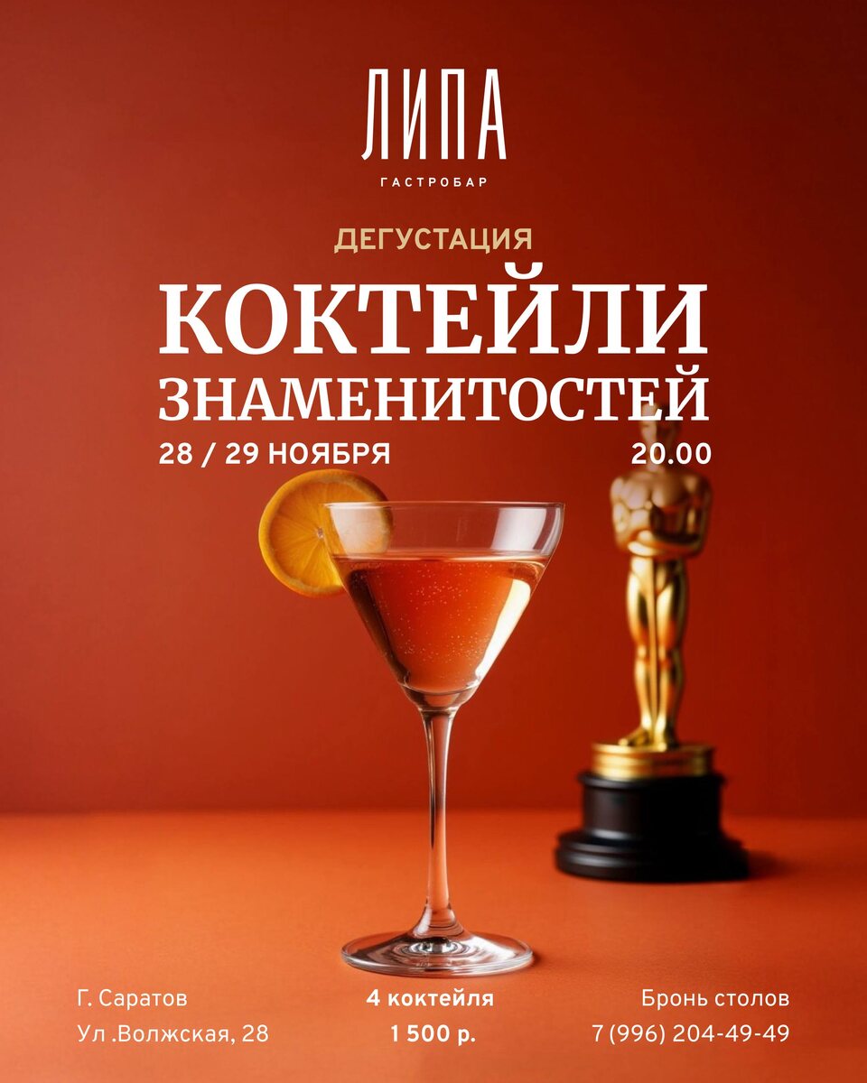 Иногда вечер сам подсказывает тему — и в этот раз она звучит особенно ярко. В эту пятницу и субботу в Липе устраиваем дегустацию «коктейли знаменитостей»: четыре вкуса, четыре настроения, четыре истории, собранные в один вечер. Каждый коктейль — как маленький портрет: стильный, запоминающийся, с собственным акцентом и настроением, которое раскрывается с первым глотком. Стоимость — 1500 ₽ Начало — в 20:00 Бронь столов: +79962044949