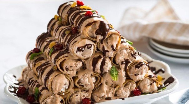 ИНГРЕДИЕНТЫ 400 г жирной сметаны 10 г желатина 3 ст. л. коричневого сахара 100 г мелкого изюма 200 г горького (70% какао) шоколада 250 мл жирных сливок 30 тонких блинов на молоке мята для украшения Приготовление Для сметанного крема залейте изюм горячей водой, оставьте на 30 мин., откиньте на дуршлаг, обсушите. Замочите желатин в кастрюльке с 0,5 стакана холодной воды на 10 мин., затем добавьте сахар, доведите до кипения – сахар и желатин должны раствориться. Смешайте желатиновый сироп со сметаной и изюмом. Дайте постоять в холодильнике 30 мин. Растопите шоколад со сливками. Выложите на рабочую поверхность для торта блин, на него при помощи мешка или шприца по ближнему к вам краю по всей длине блина выложите шоколадную смесь, вдоль нее – немного сметанного крема. Сверните в рулет. Таким образом приготовьте рулеты из всех блинов. Выложите слой блинных рулетиков на блюдо, залейте сметанным кремом. На него выложите слоями остальные рулетики, поливая их кремом, так чтобы получилась