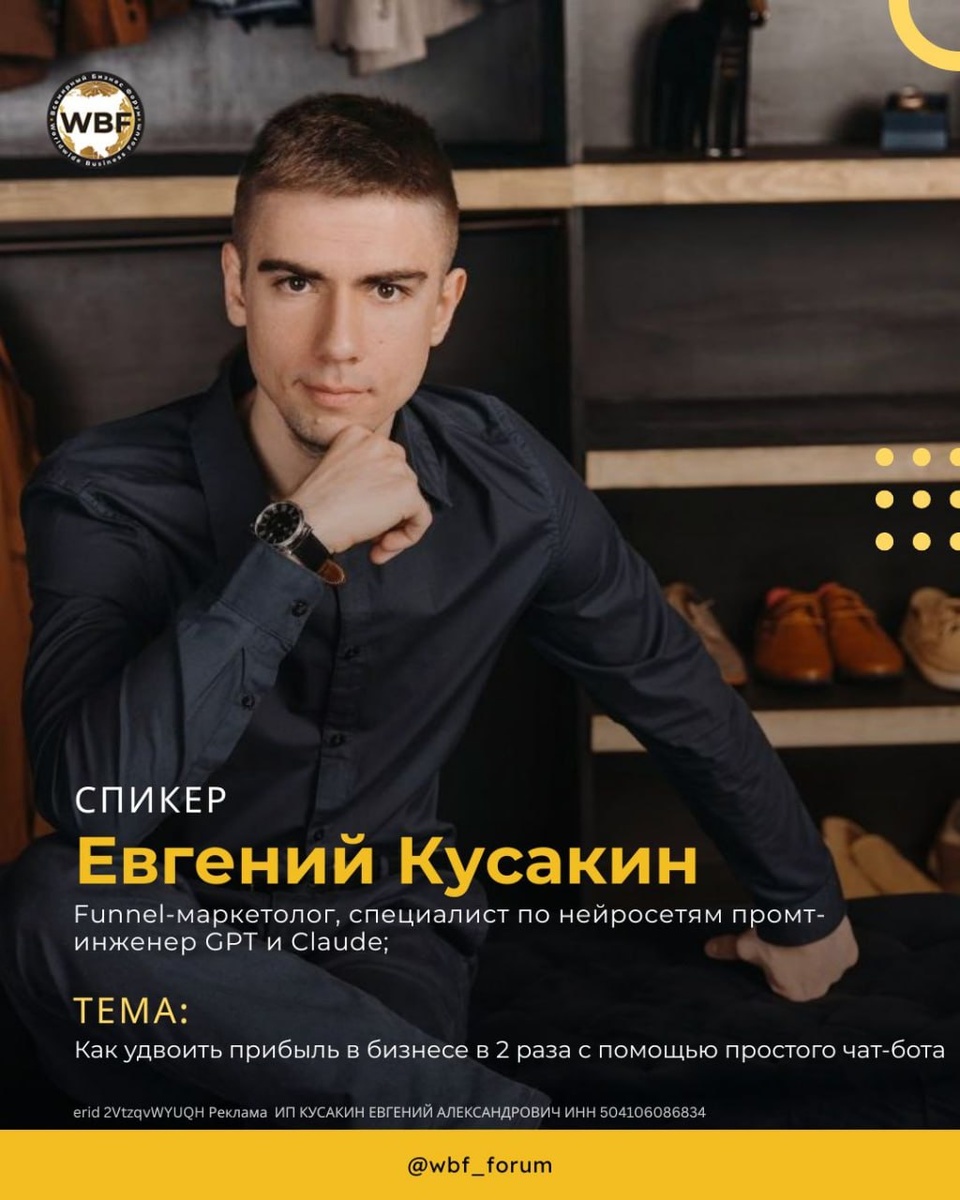 СПИКЕРЫ ВСЕМИРНОГО БИЗНЕС ФОРУМА 🎙 ЕВГЕНИЙ КУСАКИН - Funnel-маркетолог, специалист по нейросетям с 10+ лет опыта в нише funnel-маркетинга и автоматизации; реализовал 850+ автоворонок и ИИ-проектов; промт-инженер GPT и Claude; работал с ТОП-экспертами, онлайн-школами и предпринимателями; через внедренные автоворонки и чат-боты привлек более 293 000 пользователей; помог клиентам заработать свыше 1 млрд рублей с помощью автоворонок и ботов; семьянин, отец, увлекается футболом. ➡️ ТЕМА: Как удвоить прибыль в бизнесе в 2 раза с помощью простого чат-бота ➡️ Контакты Телеграм https://dzen.ru/id/5ac3ddd7dcaf8eabad1efcbf Ютуб https://youtube.com/@ev.kusakin ********** 🎙 СЕРГЕЙ БЕКРЕНЕВ - Серийный предприниматель, общественный деятель, инвестор, кандидат экономических наук; основатель и владелец ELS GROUP, объединяющей ведущие сервисные IT-проекты России: ЕЮС, Теледоктор 24, Налогия, Добросервис, Зелёная планета ELS, ELS бизнес, Digital ВЭД, ELS LAB; создатель преобразующего бизнес-простран